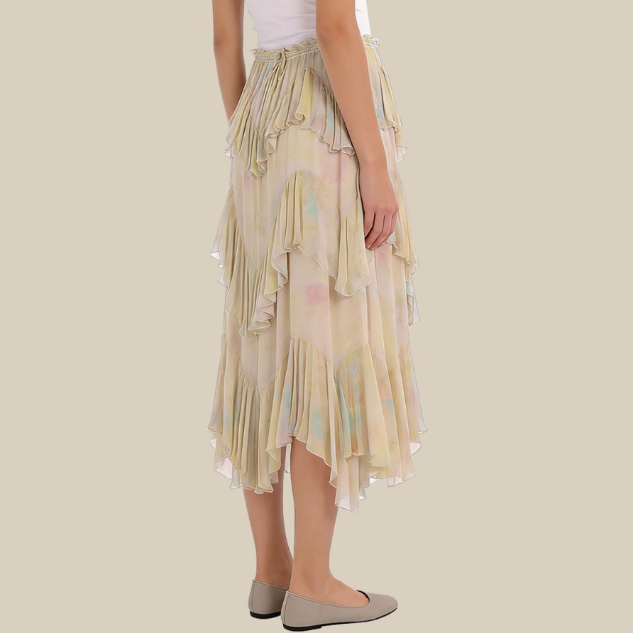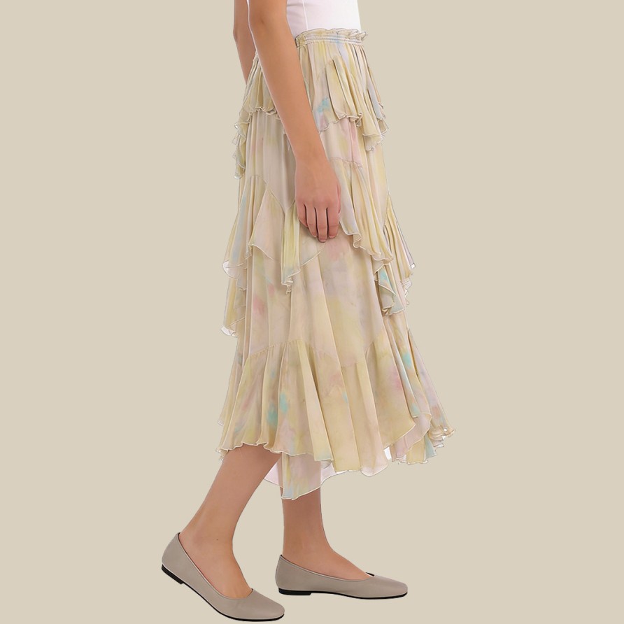 This midi skirt is crafted from 100% polyester, a lightweight, soft, and breathable fabric that is also washable, environmentally friendly, durable, and easy to care for. The skirt features a delicate printed pattern, adding a touch of vintage charm, while incorporating stylish layered embellishments for rich texture and a natural sway with every step, showcasing a graceful and dynamic look.