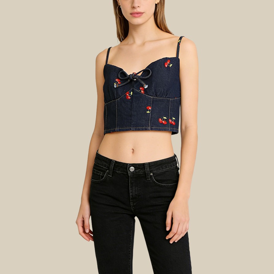 A delicate cherry embroidery adorns the front of the vest, adding a touch of retro sweetness and making the overall look more stylish and eye-catching. The eco-friendly and breathable fabric is suitable for everyday casual wear, street style, or parties, effortlessly creating a fashionable style that blends retro and playfulness.