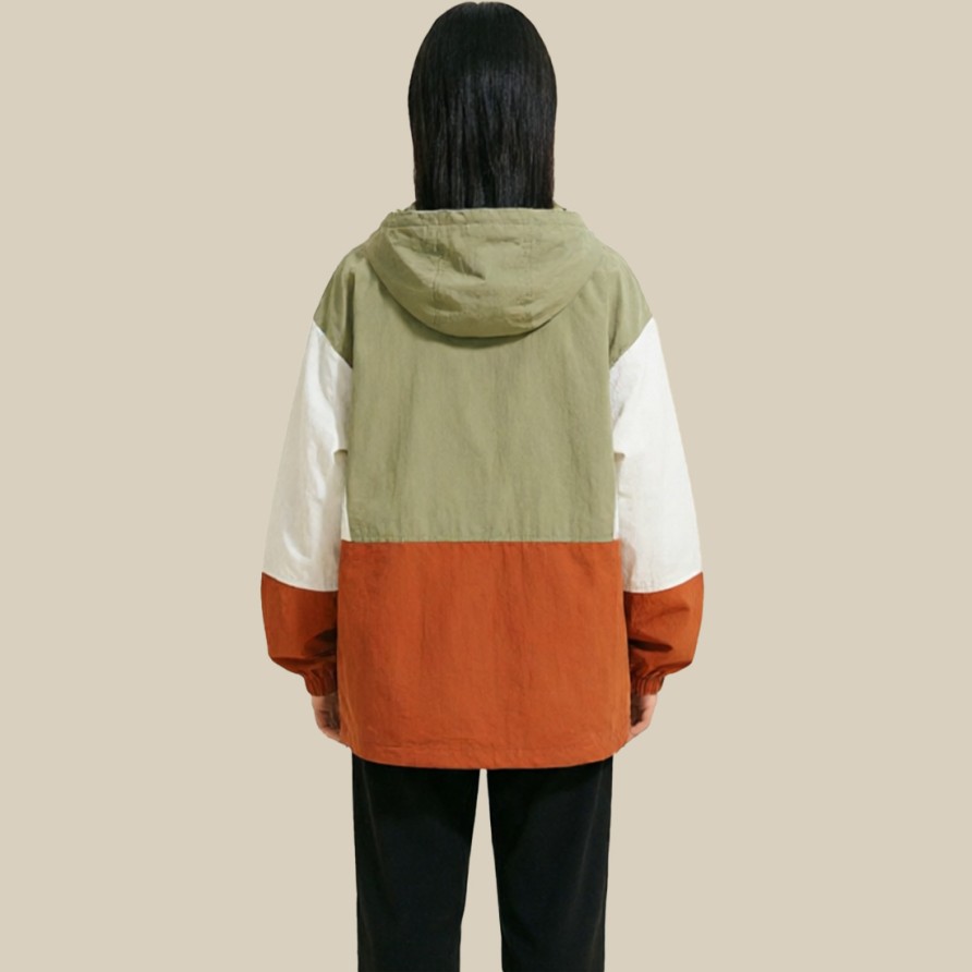 The design incorporates color-blocking elements with a stand-up collar, presenting a clean and sleek American sportswear style. The front features a smooth and durable zipper closure for easy on and off. The relaxed fit provides ample room for movement and is unisex, suitable for adults. Three-dimensional patterns and natural pleats add depth and a more dynamic and fashionable look.